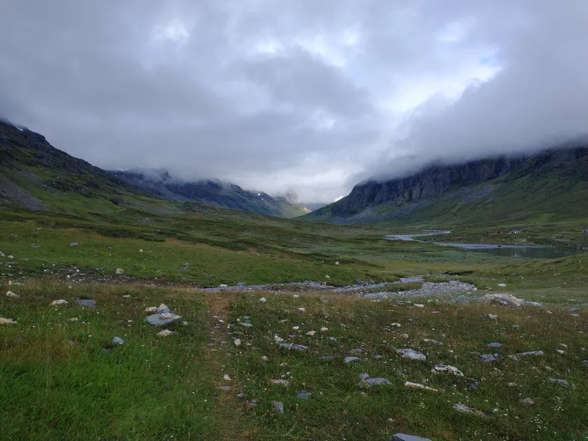 Eftermiddagen bjuder på tråkigt väder och vi håller oss inomhus. På kvällen går vi en kort promenad i trakterna. En hel del människor tältar i dalen, nästan bara Hillebergtält ses. Känns som att det är en överrepresentation av röda Hilleberg Nallo just här.