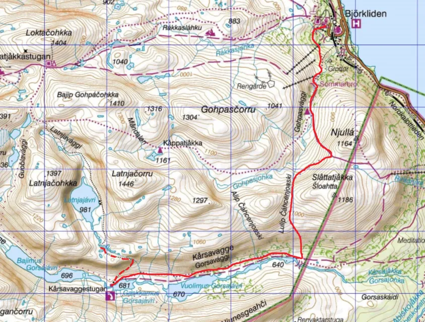 Dagens mål är Nallostugan. Jag är på strålande humör. Vi besökte Nallo även förra året. I mitt tycke är (dock kanske inte längre) den östra delen av Stuor Reaiddávággi (från Nállu ned till Visttasvággi) den vackraste dalgången i Sverige. Jag ser mycket fram emot att komma tillbaka. Målet för morgondagen är även det mycket lockande – en bestigning av Šielmmáčohkka. För att ta oss till Nallostugan ska vi först vandra Kungsleden till Tjäktjastugan och sedan svänga av sydöst och gå upp genom Šielmmávággi innan vi kommer ned till Nallostugan från nordväst.