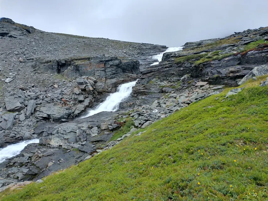 Till en början går vi tvärs över långsträckta åsar av sten, grus och gräs. Märkligt, men häftigt, landskap minst sagt. Regnet avtar i takt med att terrängen blir alltmer karg. Efter ett par kilometer går vi på blockmark. Världens färgspektrum utgörs av 49 grå nyanser. Blöta moln ligger lågt över våra huvuden. Då det inte regnar och då klockan börjar närma sig 12 bestämmer vi oss för att chansa och stanna för en lunchpaus strax innan sjön söder om Šielmmáčorrus 1664-topp. Självklart regnar det så snart vi satt oss ned. Pausen blir kort då maten intas fort.