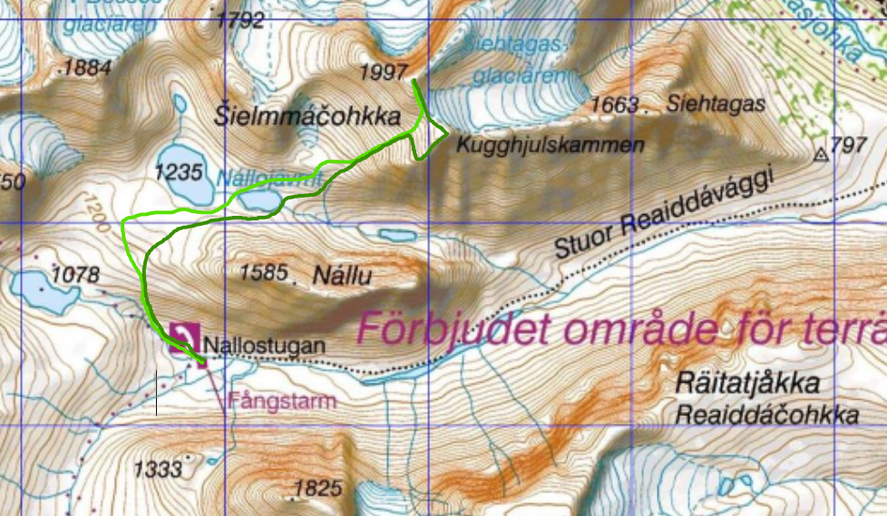 Vi tar oss relativt torrskodda över Nallojohka och vandrar sedan nordvästlig riktning upp över Nallús västra utlöpare. När det planar ut tar vi kurs mer norrut och når slutligen södra kanten av sjön 1235 där vi korsar ett snöfält. Sedan vandrar vi österut och korsar det lilla vattendrag som förbinder sjön 1235 med dess lite mer östliga granne. Nu går vi i nordöstlig riktning och börjar ta höjd. Stenarna vi går på växlar kraftigt i storlek, färg och form. Till en början är de ganska stora och ger bra fäste för att sedan bli mindre och vassare. De rasar under fötterna och börjar glida ned längs den branta sluttningen. Ibland följer lite större sten med och då känns det obehagligt. Vi tar oss över två relativt branta snöfält som ändå ger gott grepp innan vi på alla fyra klättrar den sista branta sträckan upp till den lilla platån nedanför den mycket lilla glaciären på Šielmmáčohkkas sydsida.