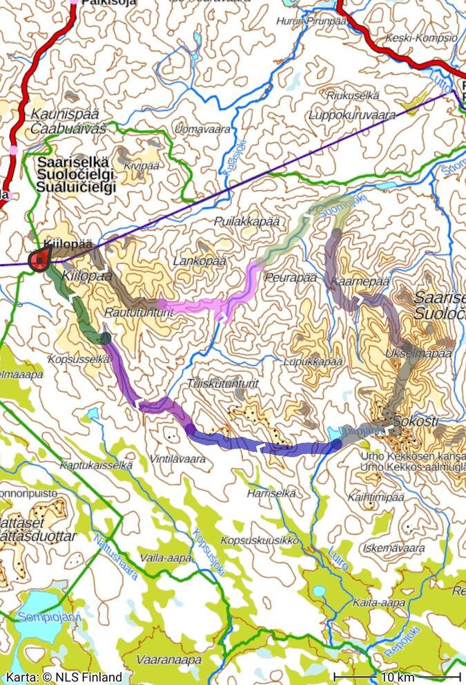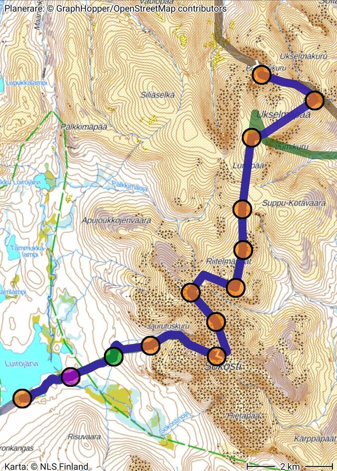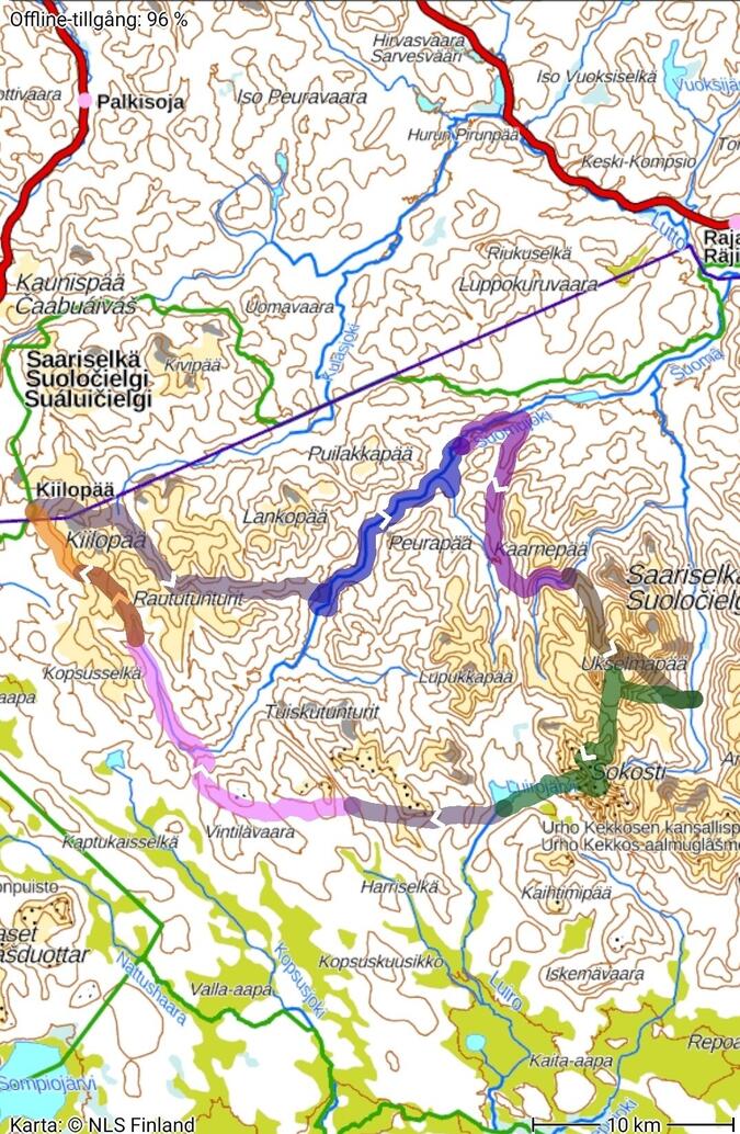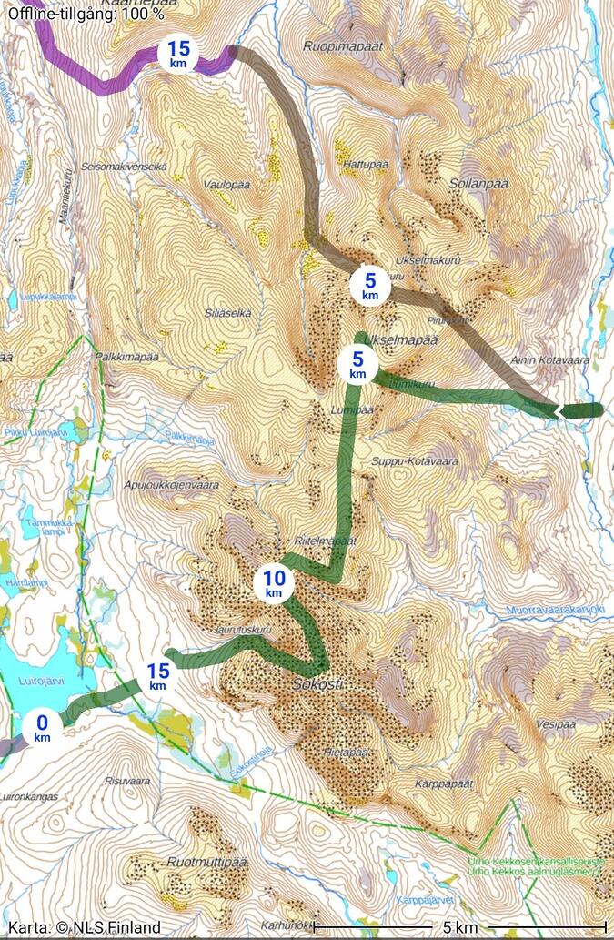 Hur tanken var jag skulle lägga upp rutten från första början, iden var att gå över bergen Ukselmapää, Lumipää, Riitelmäpäät för att nå Sokosti men jag insåg efter en stund att tiden skulle inte räcka till för hinna se Paratiisikuru, Pirunportti, Lumikuru, Sokosti samt avsluta dagen i Luirojärvi