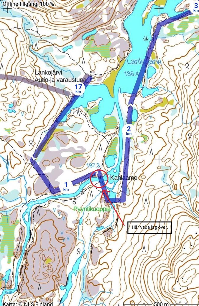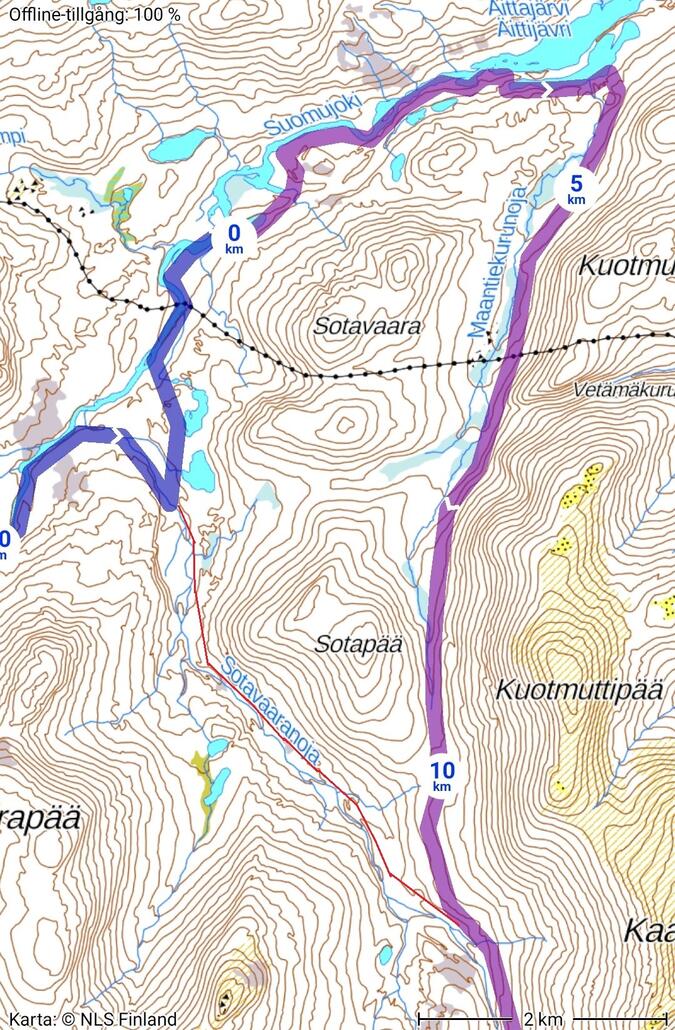Där den röda markeringen går så är det säkert fullt möjligt att gena vilket skulle nu i efterhand kanske varit ett bättre alternativ. Det går en svag omarkerad led som är svagt utmärkt på kartan längs med ån Sotavaaranoja, sedan hur bra leden är i skick där kan jag inte svara på.