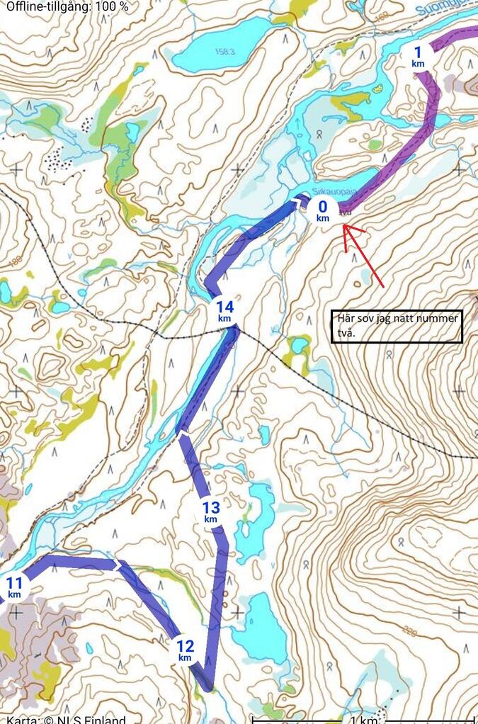 Eftersom jag somnade tidigt kvällen innan så vaknade jag väldigt tidigt denna morgon och jag var snabbt iväg. Även fast denna morgon var väldigt dimmig så var det otroligt fint när det var i princip vindstilla. När man lämnar Tuiskukuru så finns det ett par leder att välja mellan, själv så valde jag att gå via fjället Vintilätunturi för att få lite mera utsikt under dagens etapp vilket va ett bättre alternativ tyckte jag. När jag nådde fram till Suomunruoktus ödestuga så valde jag att äta lunch. Där så såg jag den underbar fina fågeln Lavskrika. Lavskrika är en väldigt orädd fågel som söker sig till människor för just föda vilket jag fick bekräftat när jag provade på att mata den från handen vilket den inte tackade nej till, snabbt så hade den tagit en bit bröd ur min hand. Efter min extremt långa lunch så vada jag över ån till andra sidan där jag satte in siktet för dagens sista etapp vilket var ett vindskydd som inte låg många kilometer bort. Efter att ha vandrat i en liten stund så var jag till sist framme vid vindskyddet. Vid detta vindskydd så finns det ett vedförråd och enklare torrdass men annars så kändes området rätt så öde men som vanligt så började det trilla in lite folk med jämna mellanrum. Även fast resan började närma sig sitt slut så var det faktiskt rätt skönt att det var sista natten som jag skulle sova i tält, under denna tur så hade vädret varit otroligt rått och kallt.