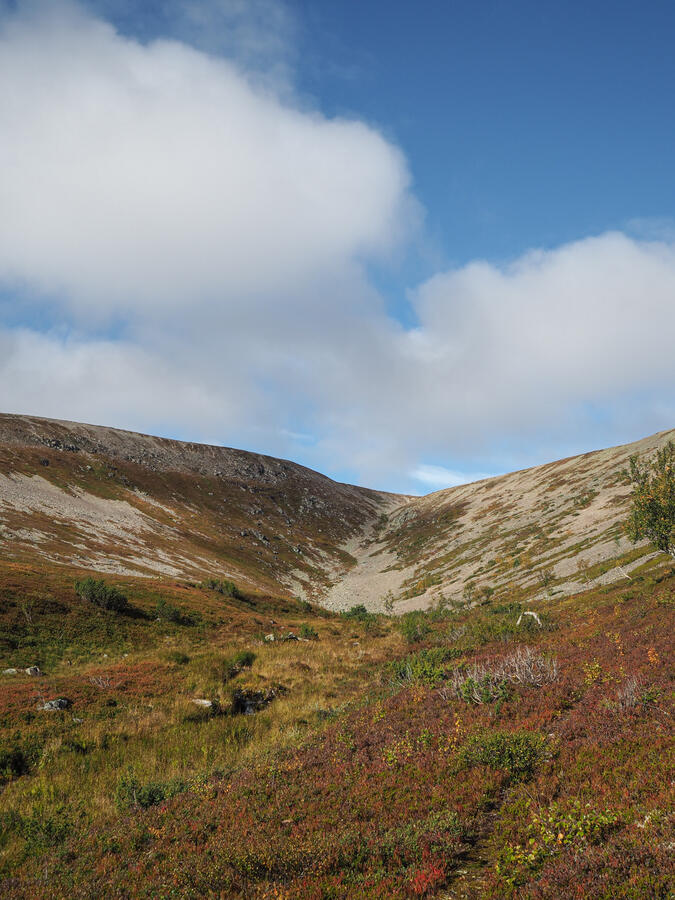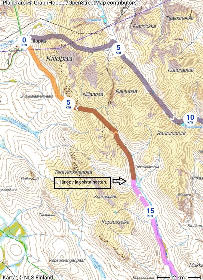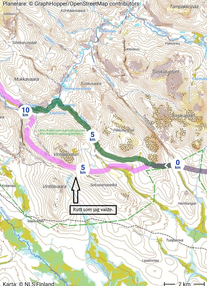 Hur det i själva verket blev, gick från Paratiisikuru upp på Ukselmapää för att sedan gå igenom Pirunportti för att ta natt i Muorravaarakka.