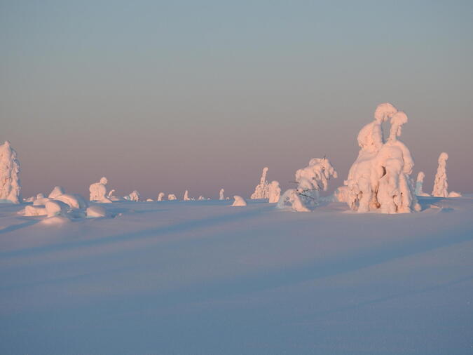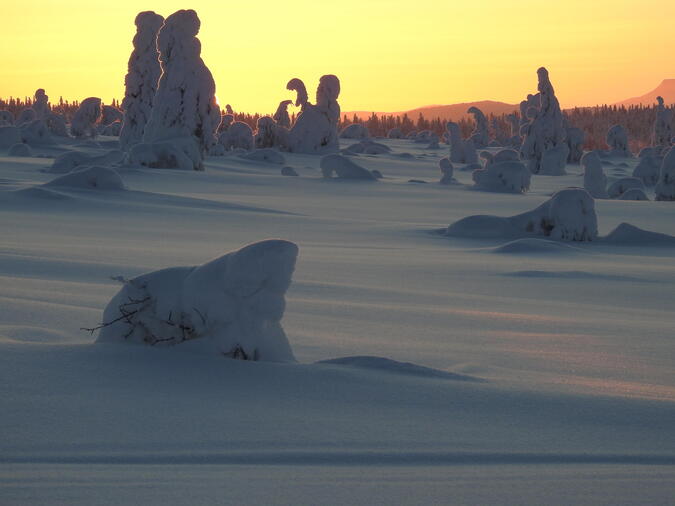 Den här bilden kallar jag de nygifta. Ser ni dem? Alla vittnen som sitter runt om och nickar. Eller så ser ni bara en snötung gran. Man kan i alla fall förundras över hur mycket färg det är i vit snö. Jag har fotat utan något filter. Det här är väl just i mellanrummet mellan röda timmen och den blå. Ett ljus jag älskar. Ja det är bedårande vackert. Nu börjar fina tider för turer till fjälls. Tyvärr är föret ganska tungt. Vi får bara mer och mer puder snö. Några vill nog ha det. Men inte vi som kör hundspann. Jag gillar nästan alla väder förutom det hårdaste fjällvädret. Akta er för svaga isar i år! Har varit på några fisketurer och blev nästan chockad över hur dåliga isarna var. Höll på att gå igen isen på ett ställe där jag fiskade förra året. Då fick jag skotta och använda borr förlängare! Det tjocka snölagret pressar upp varmt vatten från myrarna som äter isen underifrån. Snön ligger och isolerar. Man kan inte se vart det är svagt! Varning.