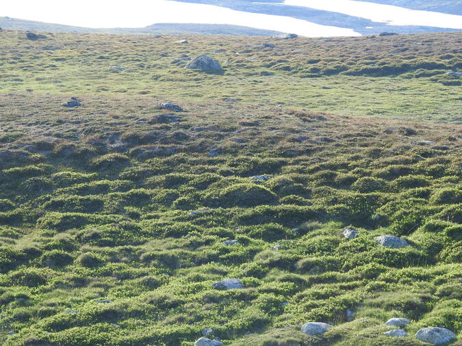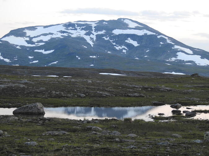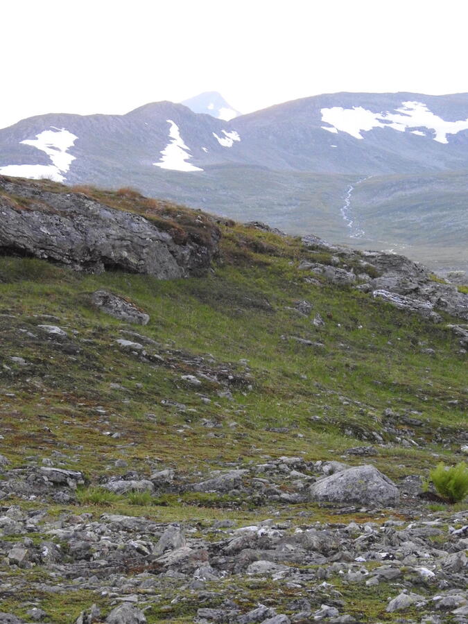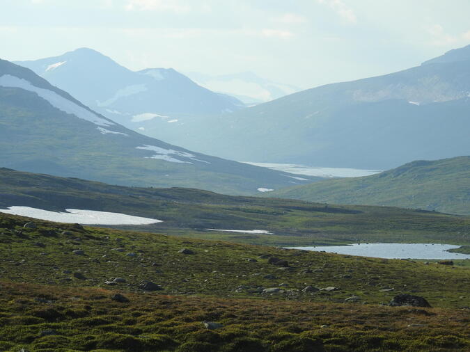 Går några kilometer och befinner mig nära Norska Börgefjell national park. Utsikt in mot den. Myggen surrar ilsket.