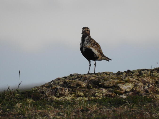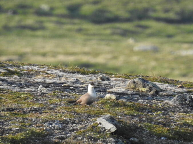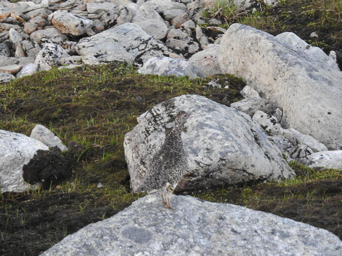 En liten fjäll rip kyckling. Den smälter in i omgivningen. Jag fotar på långt avstånd. Går sedan min väg för att inte skrämma upp dem. Fjället är fullt av dem som vill ha ripan till middag.