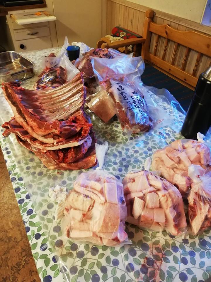 Här uppe i Lappland är vi vana att ha nytta av varandra. Hjälpsamhet. Man kan inte klara sig ensam. Det mesta av maten skaffar vi själva från naturen. Det är ju lite inne nu att äta närproducerat. Nåt jag är uppvuxen med.Jag odlar tillsammans med min mamma all potatis vi äter. Mest blir det mandelpotatis. Kött och fisk äter vi flera gånger i veckan. Köper sällan någon köttprodukt. Det mesta kommer från skogen eller bönder i närheten. Det är en styrka att själv kunna ta vara på det. Här har jag styckat en ren på köksbordet. Den fryser jag ner för att sedan äta av hela långa vintern. I frysen förvaras ren,älg,fågel och fisk. Det delar plats med bär och svamp. Mycket av svampen torkar jag. Inget får förfaras. Vi tar hand om allt. Benen äter hundarna upp.