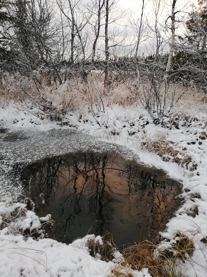 Vatten är livsviktigt. När man är ute på långa turer är det bra att veta var man kan hämta vatten. Ofta stannar jag ute en natt eller flera. Att bära med sig dryck är tungt. Kallkällan är en plats som för mig nästan är magisk. Då man vandrat i blöta myrar med brunt myr vatten och så kommer man fram till en kallkälla med kristallklart vatten smakar fantastiskt gott. Jag böjer mig ner och tar vatten i min kåsa. Så ser jag en groda simma förbi under iskanten. Vi delar samma livsutrymme grodan och jag. Vi behöver båda vatten. Det ger ett perspektiv. Det är samma vatten som dinosaurierna drack. Det sa Torbjörn en gång när han skjutsade mig med båten över Tjulträsket. Det liksom fastnade i mitt medvetande. Vattnet är värt så mycket mycket mer än vi kan förstå.