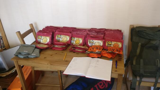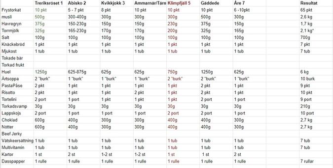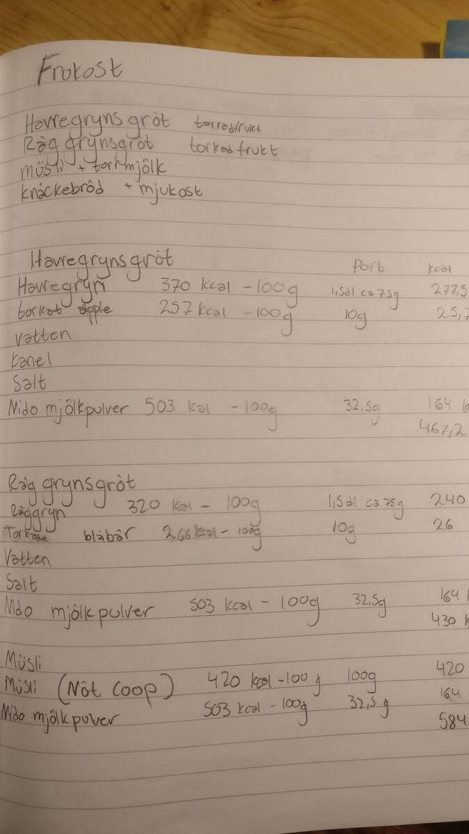 Jag gjorde prydliga tabeller över olika typer av gröt med torkad frukt och bär, olika varianter av torrmjölk, knäckebröd, rågbröd och mjukost. Även för nötter, nötblandningar, torkad frukt och choklad. Målet var att komma upp i minst 3 500 kalorier per dag, en siffra som är tagen helt ur luften. Jag räknade även med att göra av med fler kalorier än så varje dag. Jag vägde ju trots allt över 150 kg med packning. Någonstans finns ju dock en gräns på hur mycket man kan bära med sig och det gissade jag borde ligga runt 3 500 kcal och att resterande skulle få tas ur lår reserven.