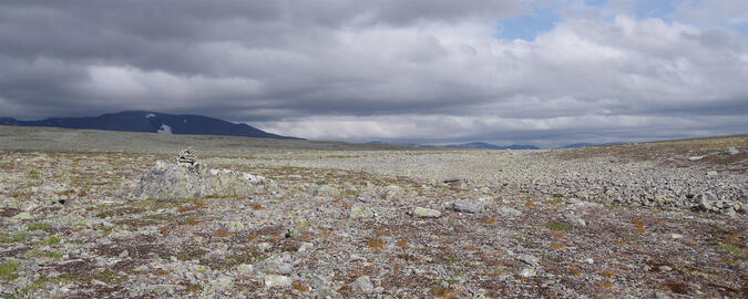 Efter den jämna sluttningen kom vi upp på karg och stenig mark som var ganska behaglig att gå på. På andra sidan skymtade snart topparna från fler fjäll.