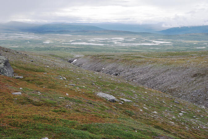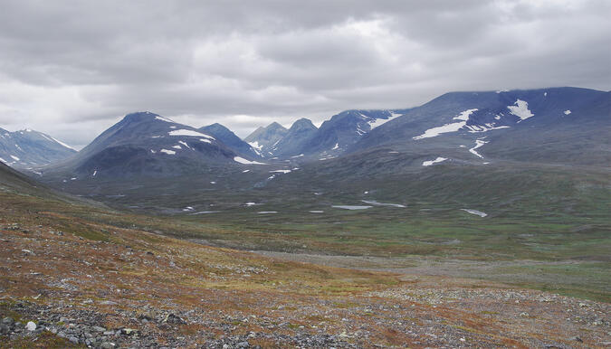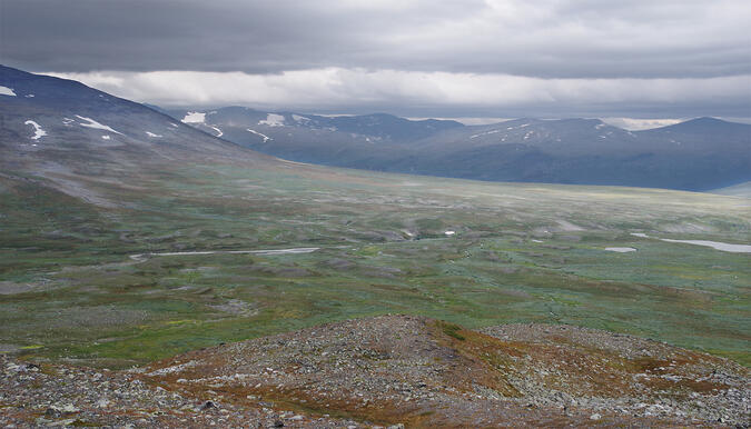 Om man går den här vägen, över passet, får man en förnämlig utsikt in mot Sareks centrala delar. I mitten av bilden ovan syns uppgången till Jiegŋavágge och man ser faktiskt ganska långt in i dalen.