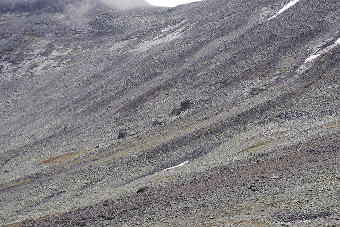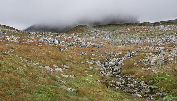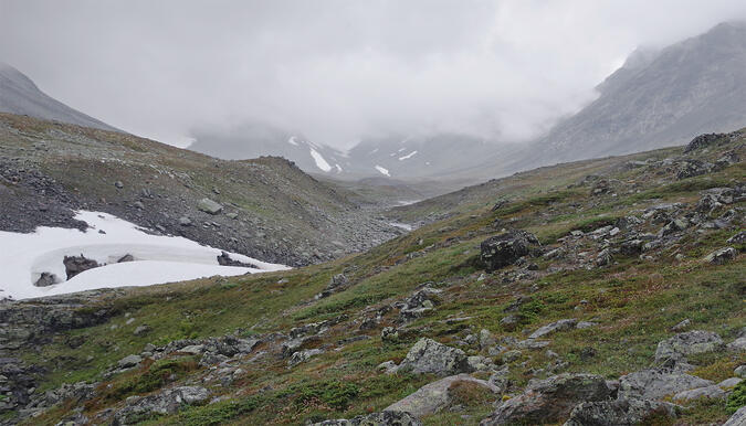 Det första intrycket av Jiegŋavágge är nog att det är stenigt, kargt och dystert. För oss förstärkte dimman och de regntunga skyarna den känslan. Men efter några timmar i landskapet så vänjer man sig. Det var så förra gången också. Man lägger märke det lilla gröna som finns bland allt det steniga och börjar tycka att landskapet är både vackert och välkomnande.