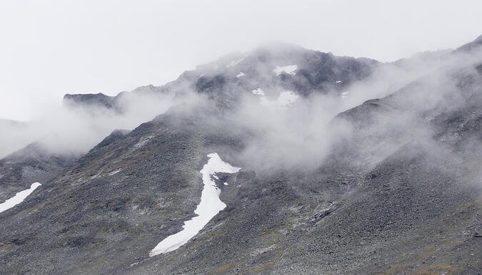 Ovan: En blick upp mot de närmaste topparna, inhöljda i dimma. Det blir inte mycket svartare och hårdare än så här. Inte ens i Sarek.