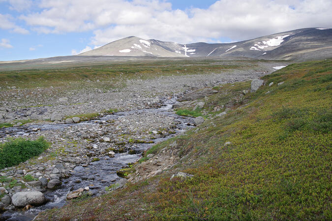 När det lutar nerför igen bör man nog undvika jokkravinerna och istället vandra på någon höjdrygg. Så gjorde inte vi utan använde delvis snöfälten över jokkarna att gå på. Men de såg faktiskt inte helt pålitliga ut överallt.