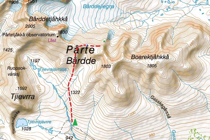 Meteorografen på Sähkok byggdes 1900 men Hamberg hade påbörjat sitt meteorologiska arbete med att placera ut nederbördsmätare på Bårdde året innan. Det fanns tre sådana 1899, en uppe på Bårddetjåhkkå, en nära Bårddejigŋas östra ände och en på höjden 1530 m ö.h. Den sistnämnda hade placerats på en flack platå på en utskjutande höjdrygg invid glaciären. Att försöka finna den platsen var uppgiften för nästa dag – en betydligt svårare utmaning än Sähkok. Morgondagen skulle säkert bli turens mest ansträngande. Skulle jag orka, särskilt om stället visade sig vara svårfunnet? Och skulle det finnas några rester kvar?