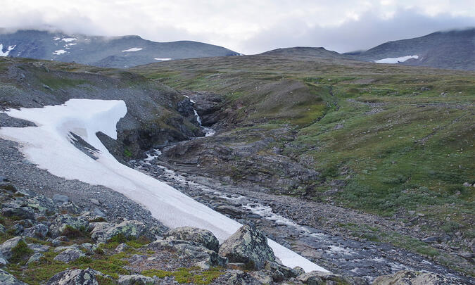 Foto av jokken som kommer från de små sjöarna (Tjievrajávrátja). Stigen från Pårekbyn går på den andra sidan, men det stora isfält som ligger över jokken är inte synligt härifrån utan ligger uppströms vattenfallet. Den som inte vill använda isfältet kan istället vada här.