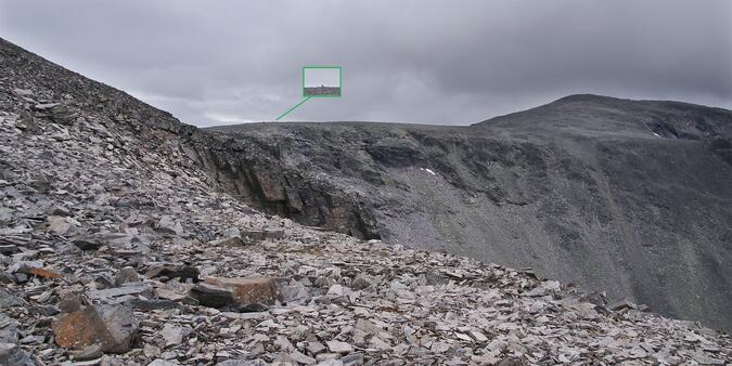 Jag följde inte ”leden” särskilt länge utan vek av en aning åt höger, uppför den mycket blockrika branten precis väster om en stor, isfri gammal glaciärnisch. Det gällde att ta höjd för att undvika nischens tvärbranta stup som jag hela tiden hade vid sidan om mig. Målet – nederbördsmätarens troliga position – fanns där den gröna pricken syns på kartan.