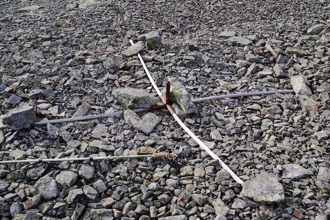 Trä- och järnrester. Vandringsstaven (135 cm lång) för jämförelse. Foto: Per Eriksson.
