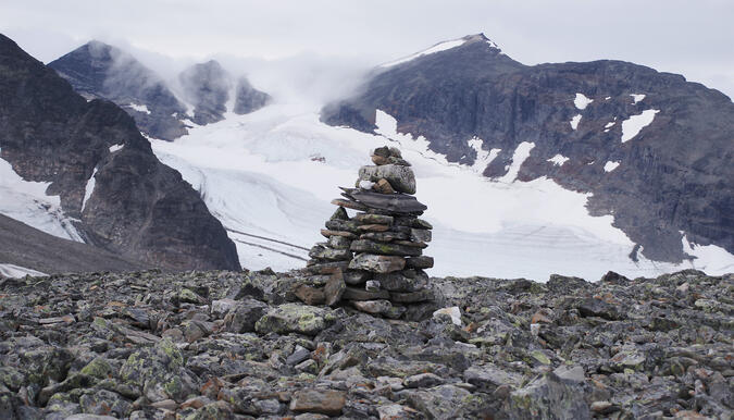 Vid Bårddes fot hade någon satt upp ett tält på den ojämna marken för att få en kort ansats upp till observatoriet eller Pårtetjåhkkå. Här syntes också de första rösningarna som utmärkte den så kallade Pegelleden som jag skrev om i en artikel på Utsidan för några år sedan – Pegelleden till Pårtetjåkkå observatorium. Men just dessa rösningar såg nya ut. Jag skulle tro att de tillkommit som ett utslag av "hjälpsamhet" för att markera vägen. Problemet är att nya rösningar som sätts upp ofta hamnar vid sidan om det bästa vägvalet. De gamla står nästan alltid rätt.
