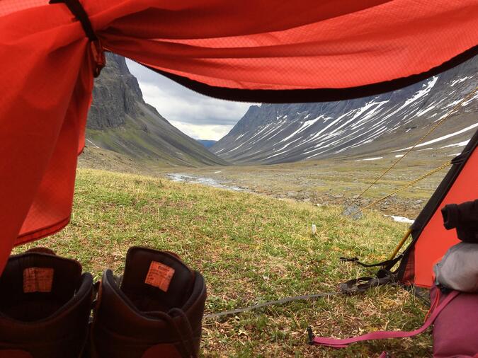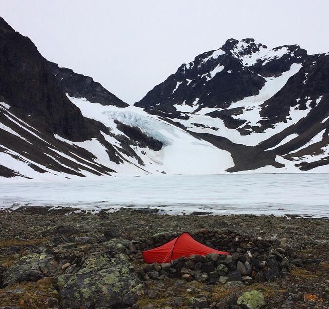 Här vaknade jag på min födelsedag, helt ok att tälta vid en glaciärsjö intill glaciärer i Tarfala. Att det regnade och blåste lite spelar ingen roll.