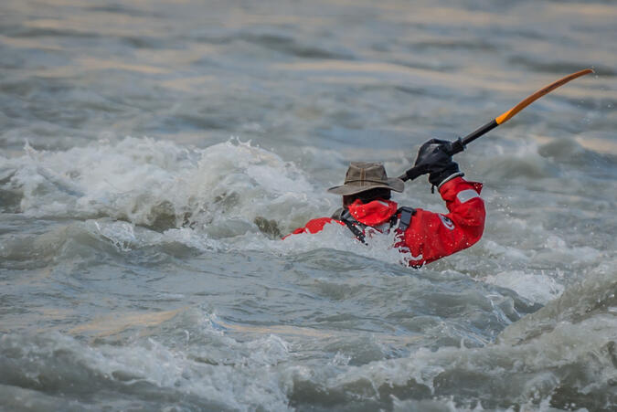 Det som vi via Google Earth trodde var en sjö visade sig vara två sjöar med en häftig fors emellan. Tur vi hade bra kajaker och torrdräkter.