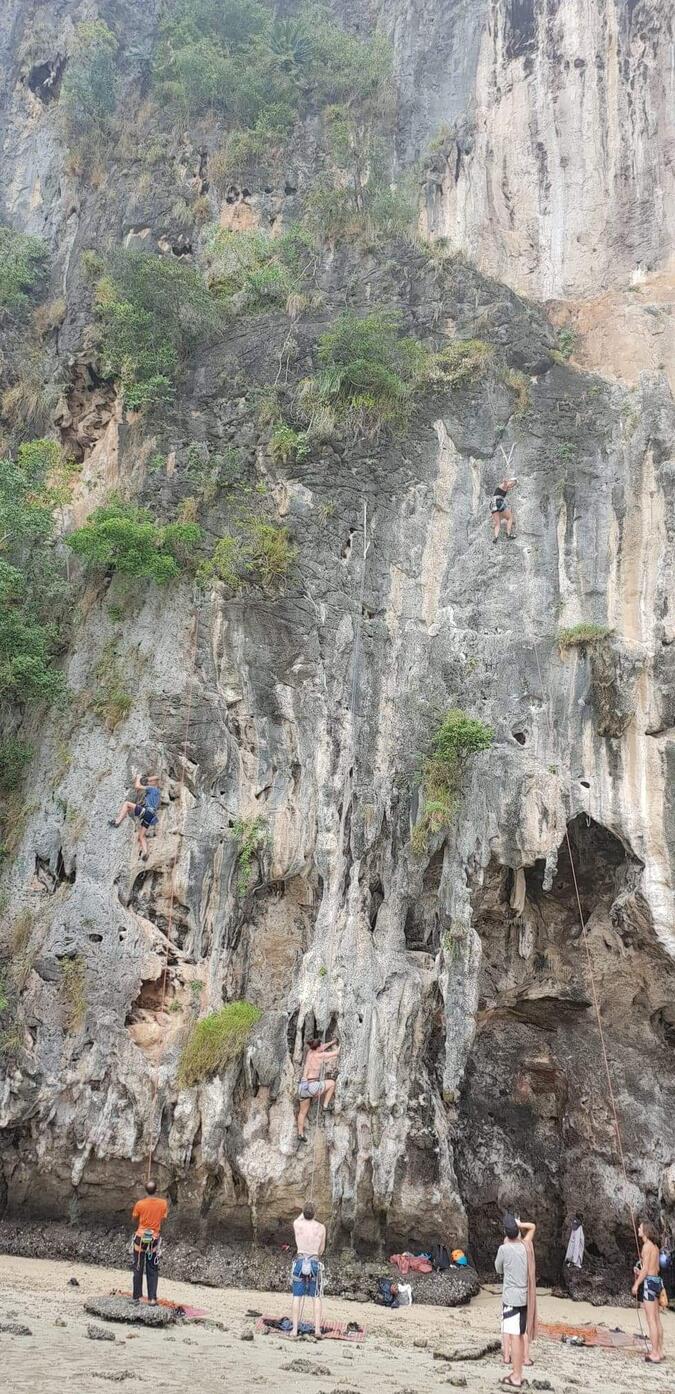 En av huvudanledningarna till att vi var några dagar på Railay beach var klättringen där. Äldsta sonen, systersonen och syster klättrar en hel del men har bara klättrat inomhus. Även make, yngsta sonen och systerdotter provade på. Jag avstod och skyllde på min axel men det var roligt att stå nedanför och titta på också. Så häftiga klippor (och höga).