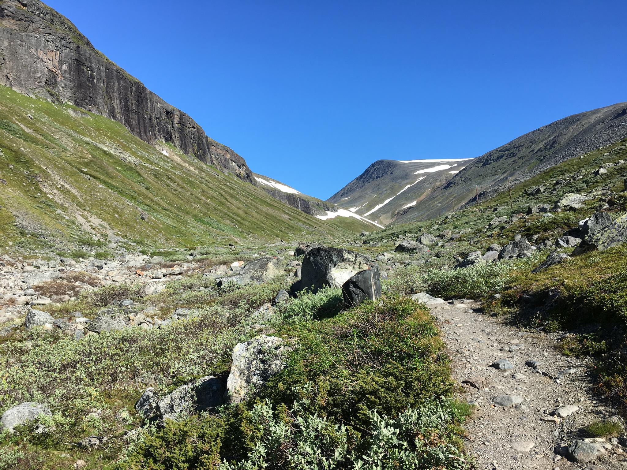 Jag antar att många som hänger här på Utsidan är sådana som ”frigår” när de är i fjällen, dvs inte nödvändigtvis alltid håller sig till de större lederna. Men jag tänker ändå slå ett slagför att ni som ev inte gör det ska våga lämna Kungsleden och göra någon avstickare. Det blir ju en helt annan upplevelse att ha en hel dalgång för sig själv! Ok, en del kanske känner att de inte ”kan”. Många jag pratat med under turen nu uttrycker någon obestämd rädsla för att inte hitta vägen. Onödig farhåga. Man går ju i nio fall av tio i dalgångar så nog kommer man rätt allt. Och led/ stig finns ofta också.
