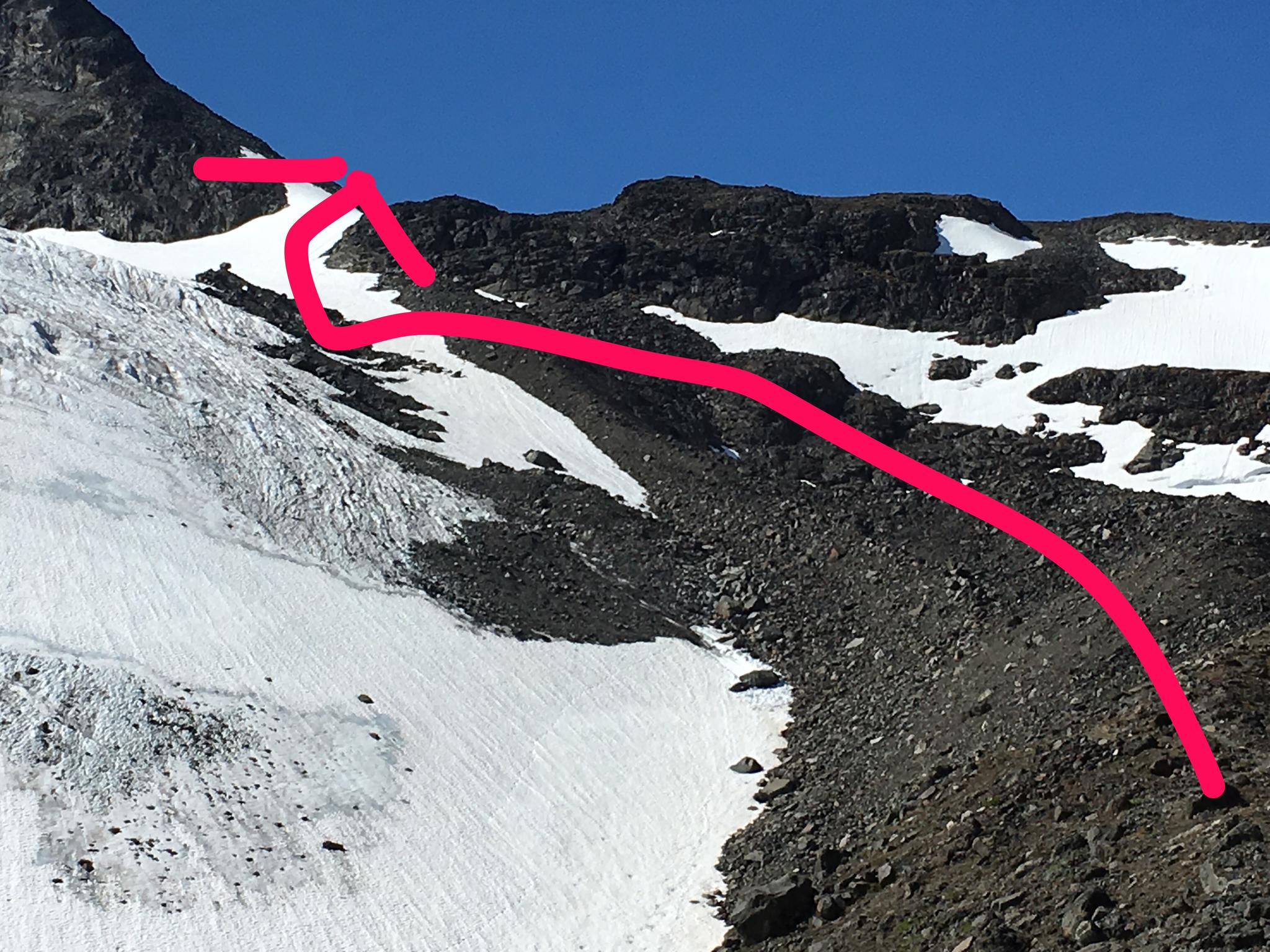 -Jojoleden! Visst går det. Den fanns med på gamla kartor men är borttagen. Den gick över en glaciär då, men den är borta nu.