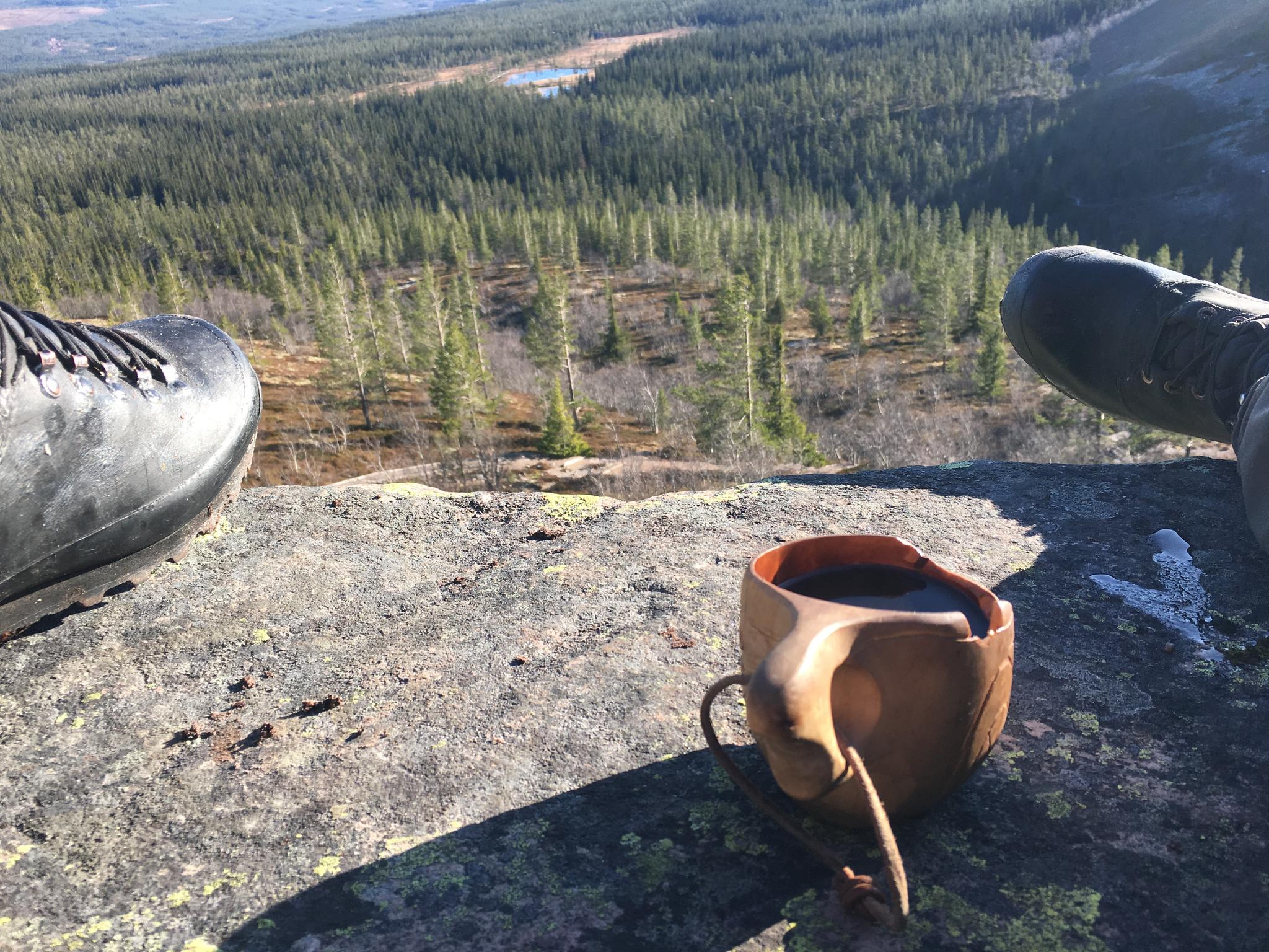 Väl uppe på platten, för Fulufjället är verkligen platt (för att vara fjäll alltså) blev det såklart fikapaus med vidsträckt utsikt. Man ska ju undvika att vara helt definitiv i sina utsagor så jag nöjer mig med att säga att jag tycker nog att det där är en av de gångerna som kaffet smakar som bäst. Smolket i bägaren var att vi, så mycket fjällvaraner vi nu anser oss vara, inte hade några kakor med oss... Har ni hört nåt så himla amatörmässigt va!?! Fast ingen skugga ska väl egentligen falla över J; det var jag som var matansvarig :-) Som tur var hade vi nötter och choklad...