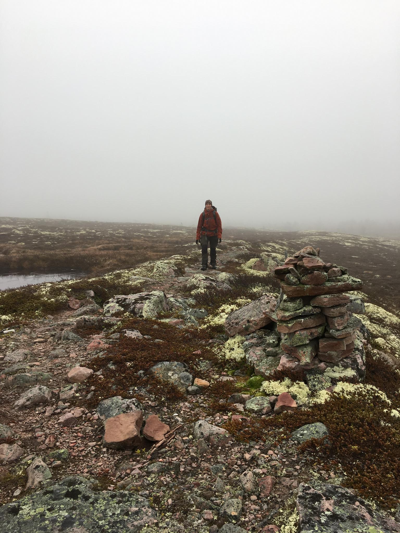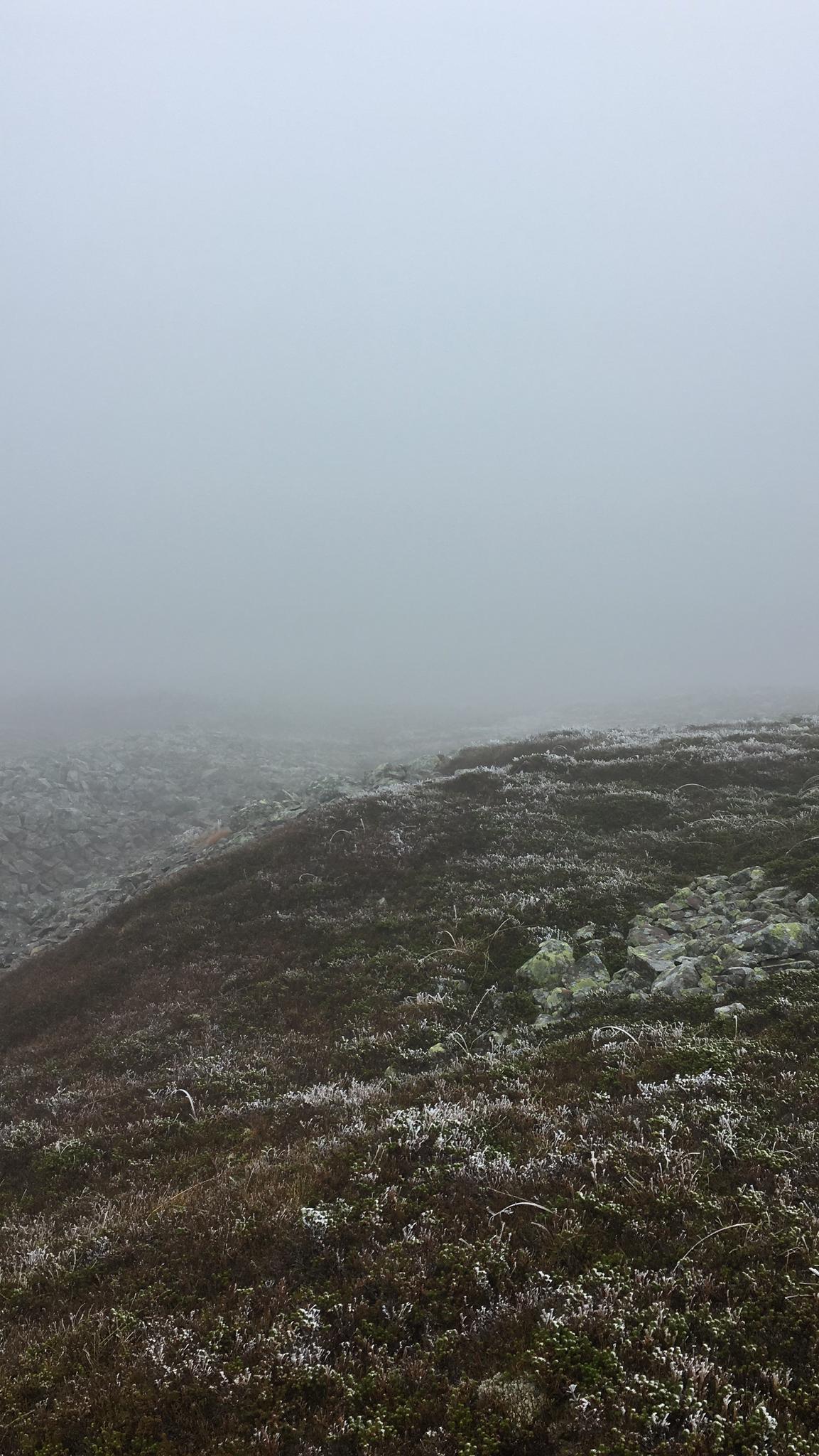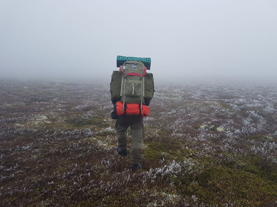 På lördamorgonen var det klart och fint ända tills vi lämnade Tangåstugan, där vi sovit den natten. Dimman drog in i takt med att vi vann höjd och ganska snart var sikten nere på 20-30 meter. Det var dock inget större problem efterom vi skulle uppför till i princip högste punkten på sluttningen vi gick på, så så länge det lutade åt rätt håll var det bara att gå på.