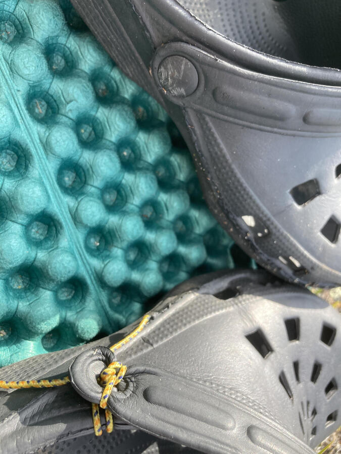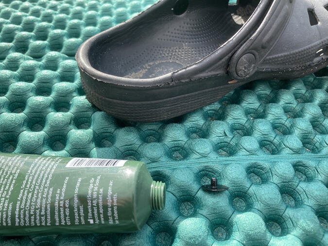 När jag lämnat Kungsleden efter att ha kommit upp över trädgränsen ovanför Pårtestugan och vikit av norrut vid Favnoajvve var det dags för kaffefika. I samband med att jag rotar fram något ur ryggsäcken så tar jag också ur mina vadarskor (ett par Foppa-tofflor av billigaste och lättaste modell) och upptäcker att de gått sönder. En av plastnitarna som håller det rörliga hälbandet på plats hade gått av. Huvuddelen av niten satt kvar (i fortsättningen kallad Pluppen) men dess ena huvud hade försvunnit och hälbandet vajade löst i luften. Attans. Hälbanden är viktiga så att skon inte åker av när man vadar, så det där var ju tvunget att repareras. Pillade loss Pluppen, stoppade den i skräppåsen och tog fram det snöre jag alltid har fickan och knöt ihop skon igen med återställd funktion på hälbandet.