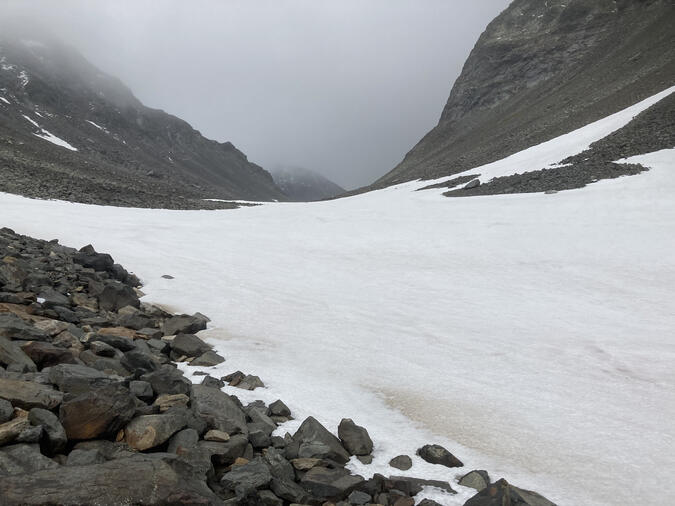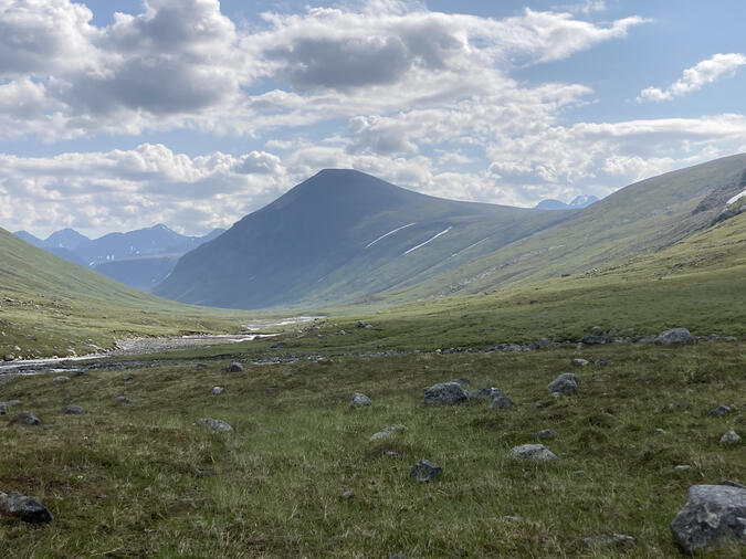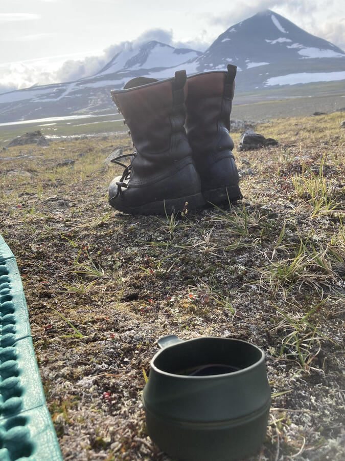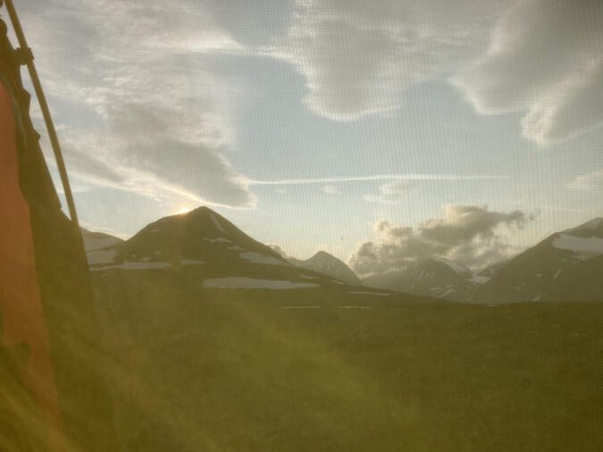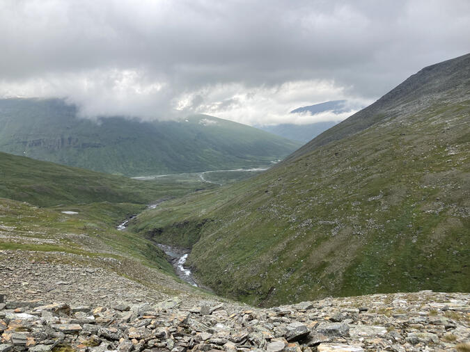 Vädret de första dagarna som jag tog på mig att gå upp till platån var bra vandringsväder; uppehåll, lagom kallt och blåsigt så att svetten håll sig borta men satta man på sig en jacka på rasten så frös man inte. Solen kikade fram nu och då. Lite lagom sådär. Ibland lagom till en rast med kaffe och Ballerinakaka. Kontrasten var stor mot de berättelser om hemskevädret som mötte mig när jag kom upp till Kvikkjock och som de jag mötte vittnade om: orkanvindar i passen, sönderblåsta tält och avbrutna turer. Hiskeligt för dem! Skönt för mig.