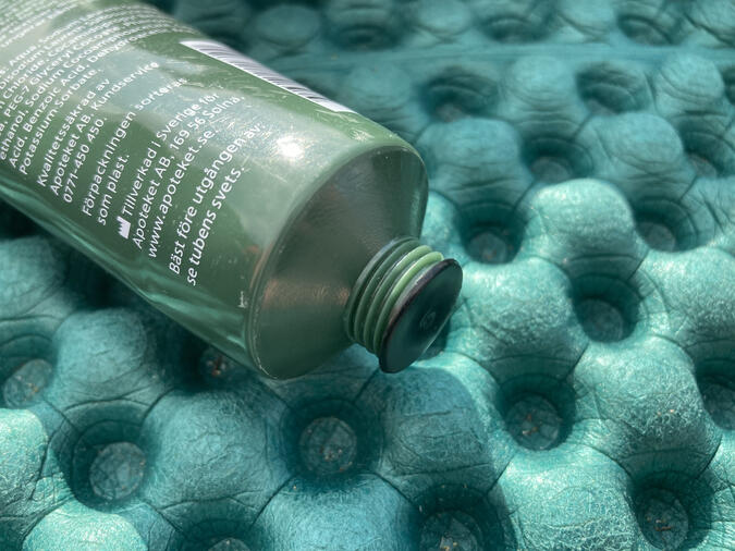 Vid första vandringsdagens slut och den obligatoriska tvagningen före kvällsmaten skruvar jag sönder korken till tvåltuben. Sönder så som i helt obrukbar. Naken, småfrusen och hungrig står jag med en full tvåltub i handen som jag inte kan stänga. Skit också. Ställer den försiktigt ner och klär på mig. Funderar på vad jag har som jag kan hälla över tvålen i, men kommer fram till att nåt sånt har jag nog inte. Inget som blir bra i alla fall. En påse kommer bara bli kladd och "lagen om alltings jävlighet" kommer göra att den går sönder i ryggsäcken i alla fall och då kommer tvåla till allt. Så det skulle inte gå. Men så kom jag ihåg Pluppen. Var inte Pluppens pigg ungefär lika stor som tubens hål? Jo kanske. Om inte kanske något skulle kunna modifieras på nåt sätt så det skulle funka. Rotade fram Pluppen ur soppåsen och… den passade perfekt. Så perfekt att man skulle kunna tro att den var till för just att sitta där. Den kunde inte åka ur av sig själv och det krävdes inte mer än ett lätt tryck för att få den på plats. Och den höll helt tätt. Säkrade den med lite skavsårstejp och så var hela problemet löst!