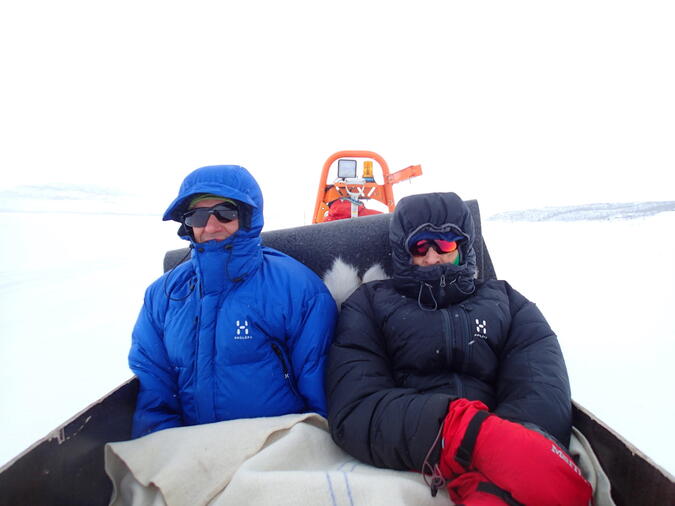 Vi hade dålig erfarenhet från tidigare skoterskjutsar att man kan frysa väldigt mycket. Vi åkte skoter 19 km västerut över Akkajaure och till slutet på sjön Ráddajávre, där vi såg vi kungsörn på nära håll.