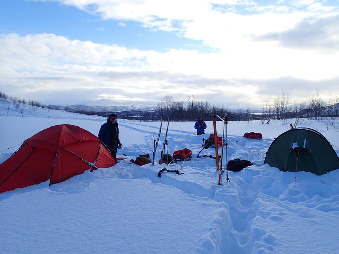 Med siktet på passet mellan berget Stibok och berget Guovdoajvve korsade vi jåkken Rähtjátjåhkå och tog vi några höjdmeter upp bland åsarna. Vi fann en plan yta med lite lä.