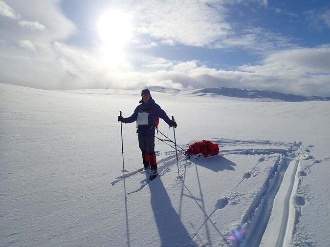 Vi åkte ner på den stora sjön Sårjåsjávrre, in i Norge och västerut på den till sjön Bajit Sorjosjávri, där vi såg några äldre skidspår. Nu följde vi Nordkalottleden mer eller mindre hela vägen till Sulitelma.