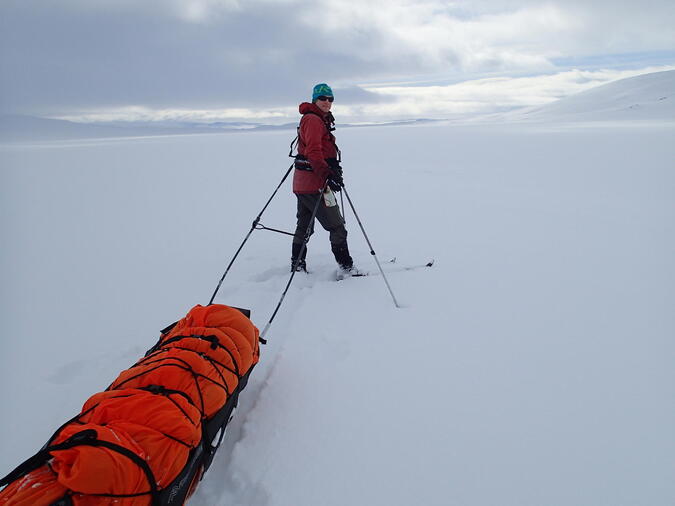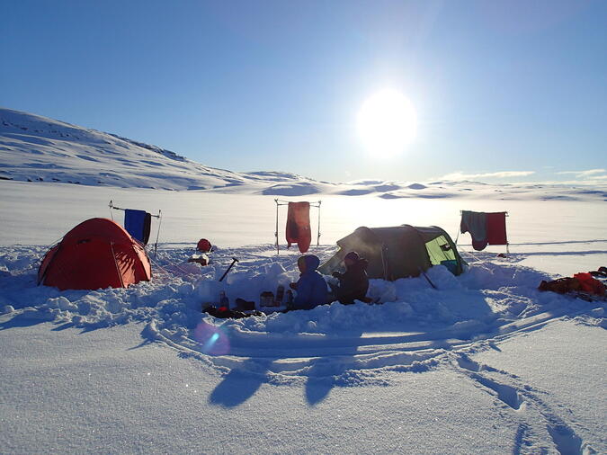 Åt Norge är terrängen mycket mer brant och stenig. Korsade sjön och tältade på andra sidan. Det snöade inte när vi åt middag, vilket det har gjort de andra kvällarna. Minus 8 grader när vi la oss på kvällen.