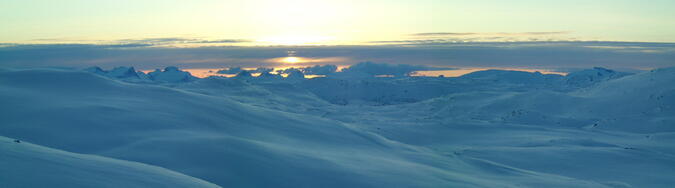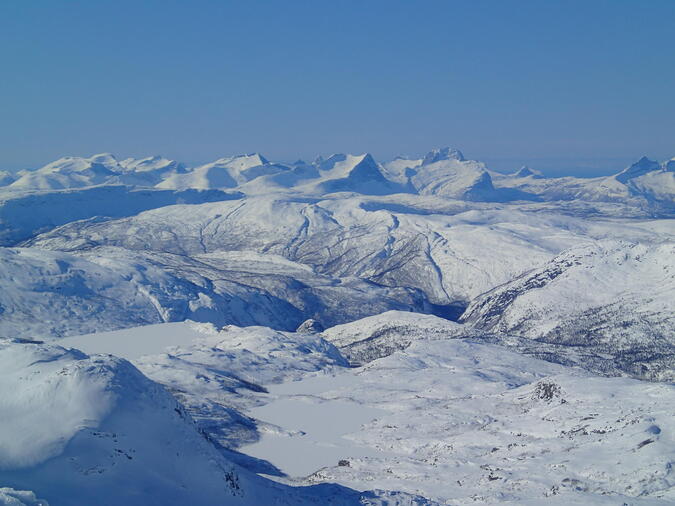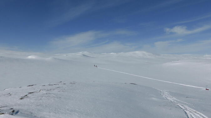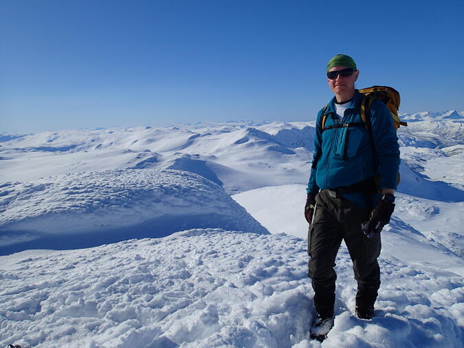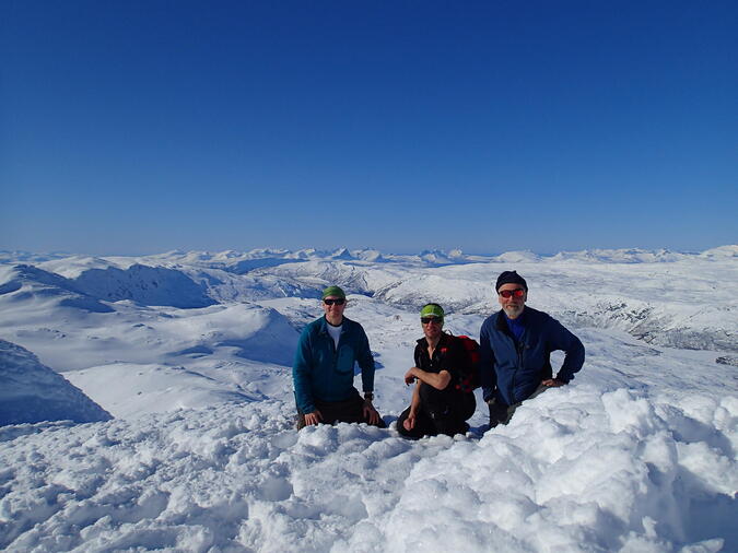 När vi kom upp till ett pass på 1100 möh och såg glaciären Blåmannsisen åt vi lunch. Varmt och soligt. Vi lämnade pulkorna och åkte de återstående 200 höjdmetern upp till Ráhkotjåhkkås topp. Otrolig utsikt därifrån: Sarek, Lofoten och Sulitelma-massivet var en del av det vi såg. Helt vindstilla och blå himmel.