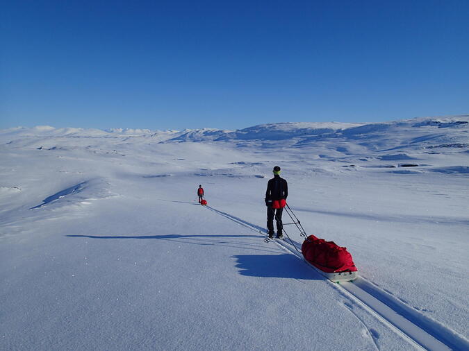 Nerfarten söderut från vattendelaren till sjön Storelvvatnan var inledningsvis brant, isig och med vindpackade snö. Min pulka välte ett par gånger och då är det bra med turkompisar som kan hjälpa till att få den på rätt köl igen.