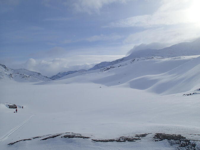 Molnigt och ett par minusgrader under dagen. Det var under dagen avtagande vind. Flatljus och disigt. Vi skidade 26 km denna dag, vilket funkade bra. Vi skidade söderut genom den fina dalen väster om fjället Viehtjer.