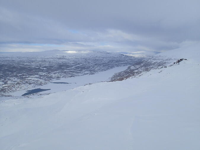 Vi fick sedan en mycket fin nerfart till sjön Slahpejávrre. Vid nedfarten fick jag testa utförsegenskaperna på mina nya skidor (Åsnes Amundsen Fram vallningsfria) och de gled mycket bra. Väl godkänt!