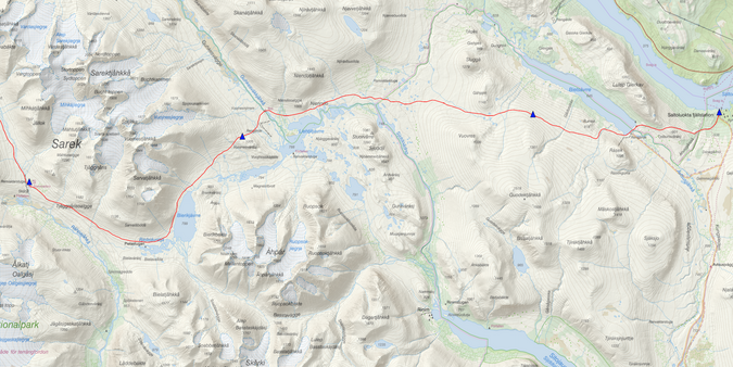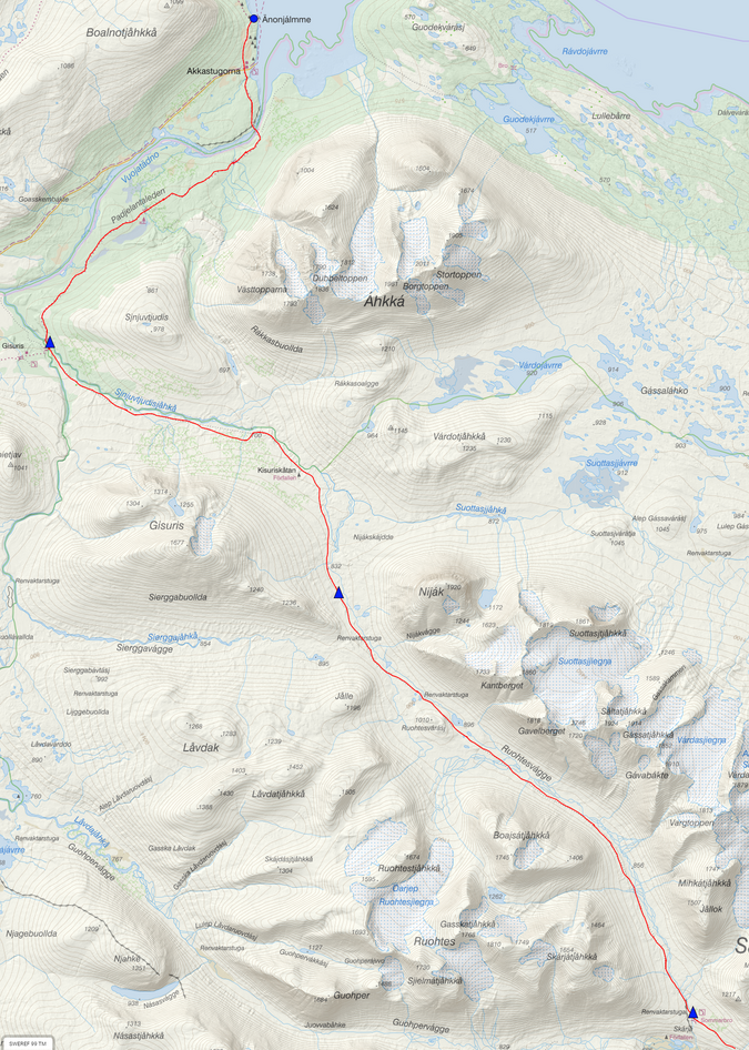 Starten på nästa morgon blir en enkel sådan då vi har nedförsbacke ner till vadet över Vuojnesjågåsj. Där nere möter vi en yngre tysk man som spenderat 14 dagar i nationalparken. Han verkar ganska nöjd över det så jag säger inget om hur länge jag varit ute. Det är ändå alltid intressant att höra om andras upplevelser. Vi samtalar en stund innan han vadar över och ger sig av mot Suorva. När vi sedan tar bron över Guhkesvákkjåhkå lämnar vi Sarek för den här gången. Vi följer också stigen mot Surova fram till och över Lulep Niendojågåsj två vad. Det är här någonstans vi möter en grupp unga kvinnor som är på väg åt samma håll. Vi ber om att få låna deras karta för att reka den sista biten fram till Saltoluokta lite närmare. Calazos Sarekkarta i skala 1:50 000 täcker tyvärr inte in det partiet. Hemma skrev jag ut den del som saknas, men det blir inte lika tydligt som en riktig karta. Det visar sig att vi på väg åt samma håll och har liknande tankar på distans och hur vi ska ta oss dit. Vi funderar ett tag på om vi ska dela på båtskjuts från västra änden av Bietsávrre. Både de och vi kommer dock fram till att vi lika gärna kan gå över fjället mellan Gähppo och Vuovres. Vi räknar med att hinna fram imorgon oavsett och då känns det dumt att chansa på båten som dessutom kostar pengar. Det ska komma att visa sig vara ett tursamt beslut.