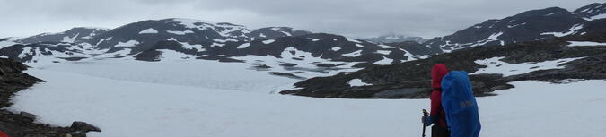 Det är fortfarande ett tjock molntäcke ovanför oss när vi vaknar. Regnet har fallit till och från under natten, men för stunden är det uppehåll. Vi torkar av det lätt fuktiga tältet innan vi packar ihop allt och inleder klättringen upp till passet. En del klipphällar passeras på vägen upp som kan vara rejält hala när det är blött. Vi klarar oss tacksamt nog utan incidenter och möts på andra sidan av vinter. Det är verkligen en markant skillnad på de olika sidorna även om jag kanske överdrev en smula nu. Temperaturmässigt är skillnaden inte stor, men det är annat med mängden snö. Bajep Sårjåsjávrásj är i stort sett helt istäckt fortfarande och många stora snöfält täcker leden. På väg ner möter vi en äldre kvinna som ser ut att ha det lite kämpigt. Dock inte tillräckligt för att vilja ta en paus och prata en stund. Ett kort "Hej!" och sedan försvinner hon uppför backen.