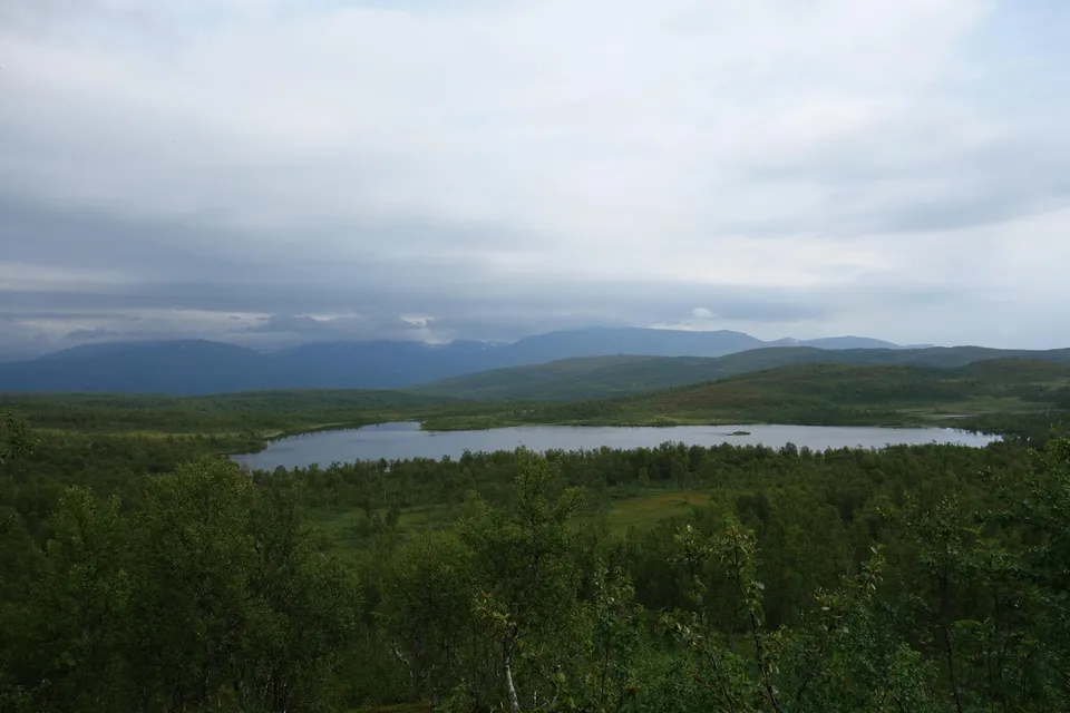 När vi tagit oss upp för de värsta branterna och det blivit lite glesare mellan björkarna så övergår terrängen mer till myrmark. Vid en större öppning dyker de små sjöarna vid Stormyran upp och vi får en bra indikation på var vi befinner oss. Även om myrmark inte är det vi önskar oss mest vid vandring utanför led så innebär det till vår förtjusning hjortron den här gången. Vi hittar ganska många på flera olika ställen och vårt tempo sjunker kraftigt igen (nu gick det i och för sig inte särskilt fort redan innan). För Vanessa innebär det hennes första färska hjortron någonsin och hon ska komma att bli närmast besatt av dessa underbara bär resten av vandringen.