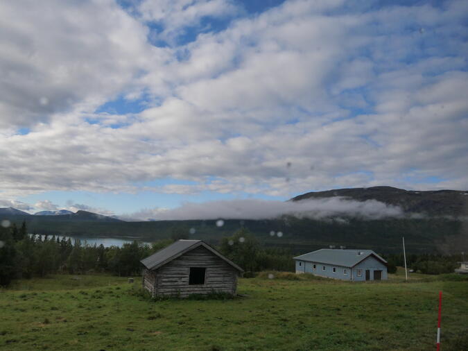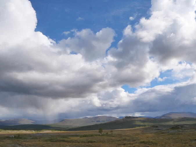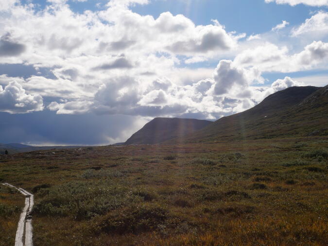 Jag närmade mig Vålåstugorna sakta men säkert. Tittade jag österut, mot Anarisfjällen, så kunde jag se att det regnade. Mäktigt och häftigt med varierande väder.