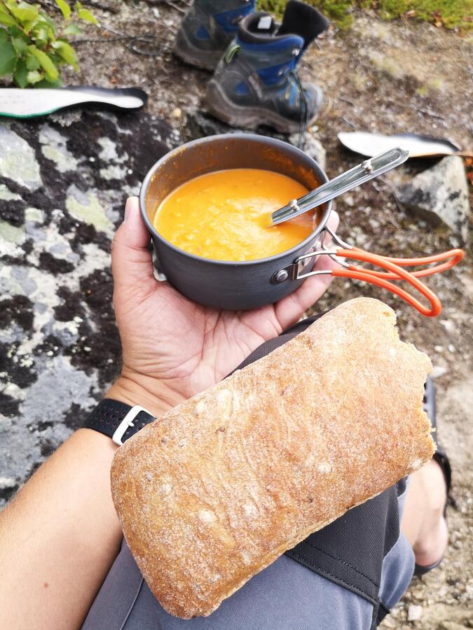 Jag nämnde att min ryggsäck var tung. Nu skulle den bli lite lättare. Latmasken i mig värmde på en tetra med någon tomatgrej och så blev det den andra ciabattan. Vips så var ryggsäcken minst 450 gram lättare.