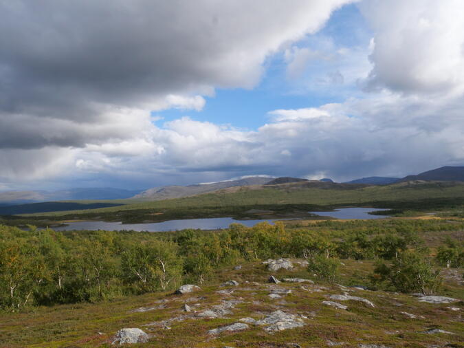 Blicken dras österut, hela tiden. Både det omväxlande vädret, men även härliga sjöar. Här ser man Kroktjärnarna, och jag har bara ett par km kvar till Vålåstugorna.