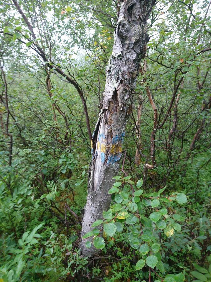 Plötsligt såg vi markeringar på grova björkar. Det var bara markeringar på de grova björkarna, ingenting på de yngre och mindre träden. Det måste vara en gammal led, och vi såg nog den gamla markeringen. Nu var vi nyfikna. Tur att vi hade Claes Grundstens guidebok med oss, som kanske kunde ge lite svar senare.