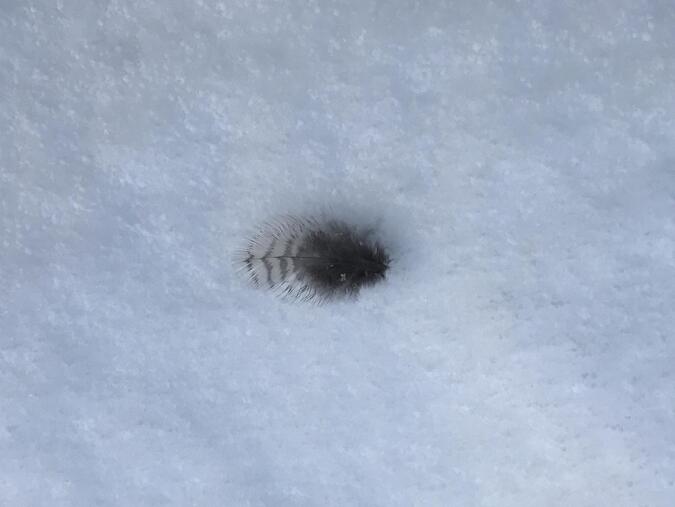 En liten vacker och dunig fjäder låg alldeles ensam i snön, någon som har en gissning på vad det kan vara för fågel? Den var ungefär fyra centimeter på längden.